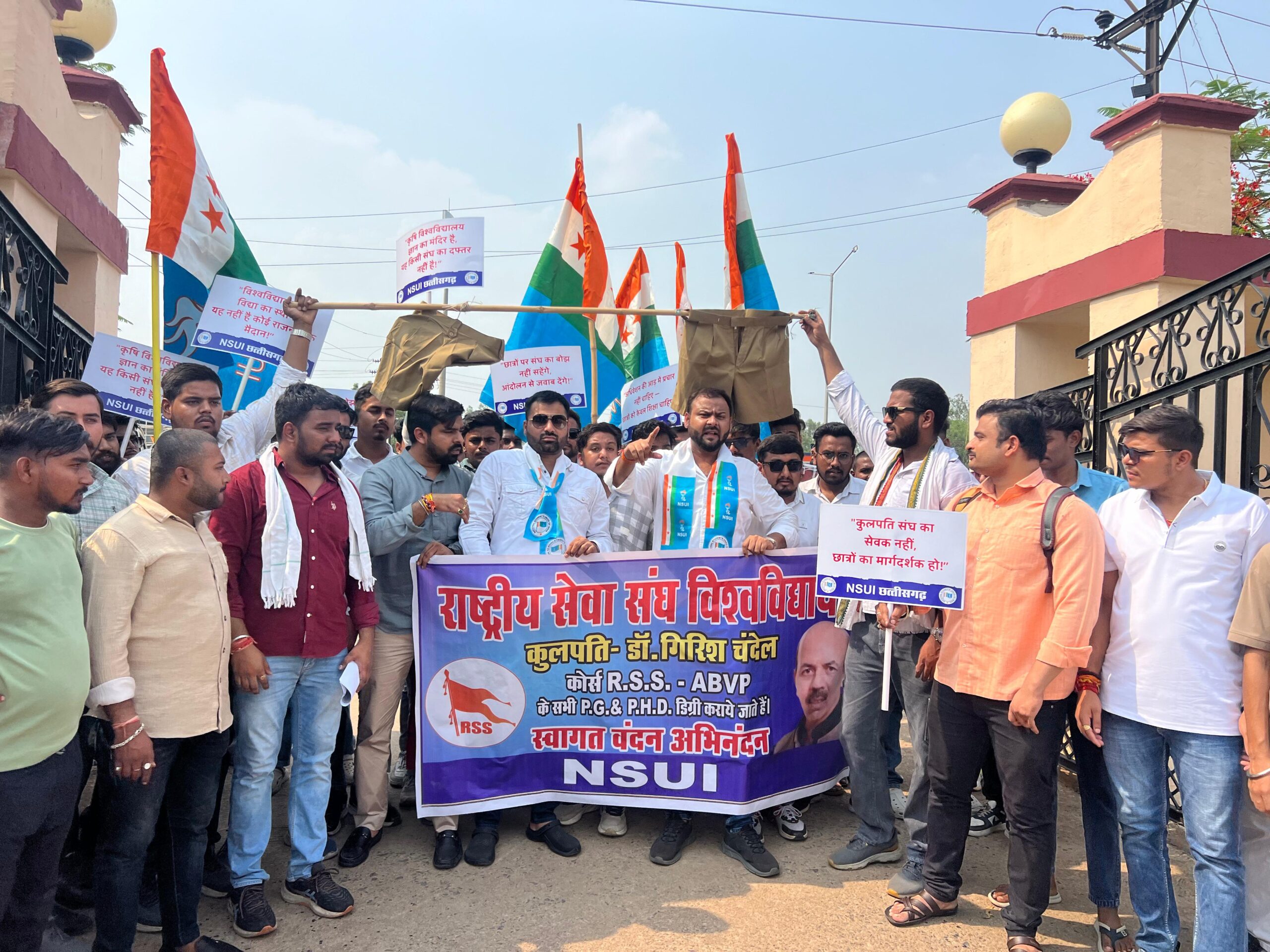 रायपुर। NSUI ने इंदिरा गांधी कृषि विश्वविद्यालय (IGKV) में ABVP के कार्यक्रम का विरोध करते हुए कुलपति डॉ. गिरीश चंदेल पर RSS एजेंडा थोपने का आरोप लगाया। NSUI प्रदेश उपाध्यक्ष अमित शर्मा के नेतृत्व में छात्रों ने विश्वविद्यालय का घेराव किया।